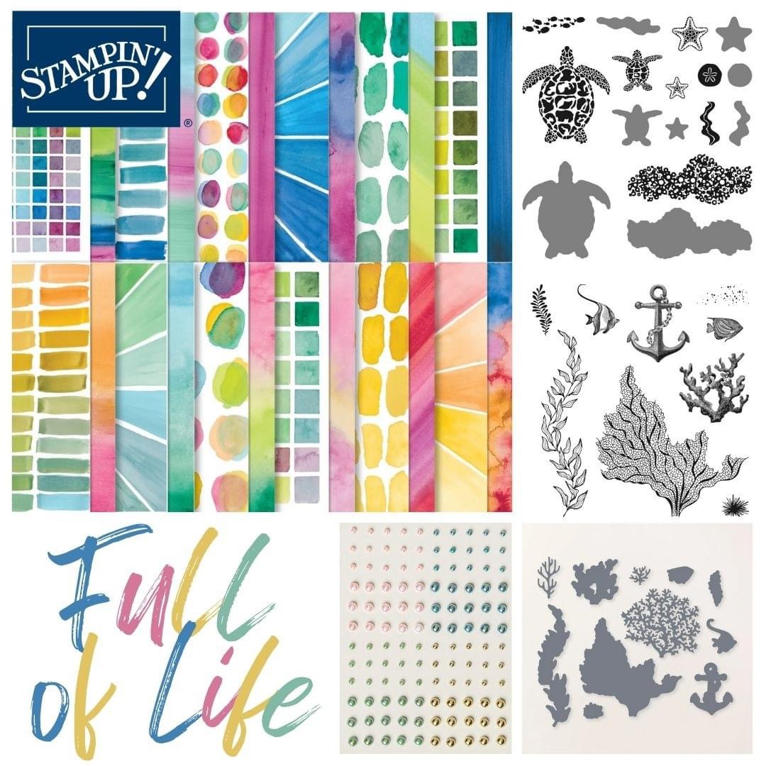 This colorful themed paper suite is perfect for fun summer days, water adventures, birthday celebrations and everything that is bright and beautiful in your life. But did you know that these beautiful watercolor designs were hand painted by in-house artisans at Stampin’ Up!? How fun is that?
