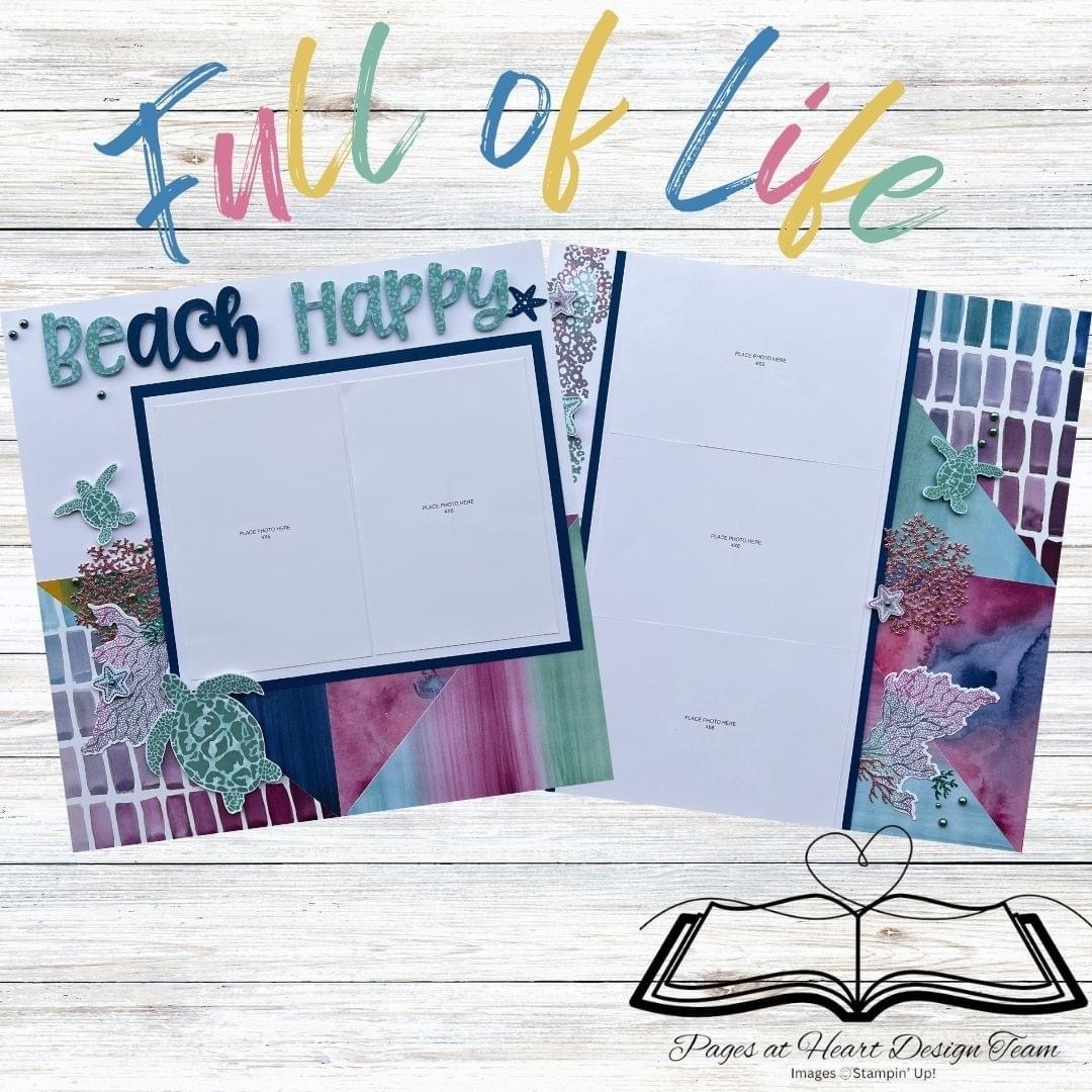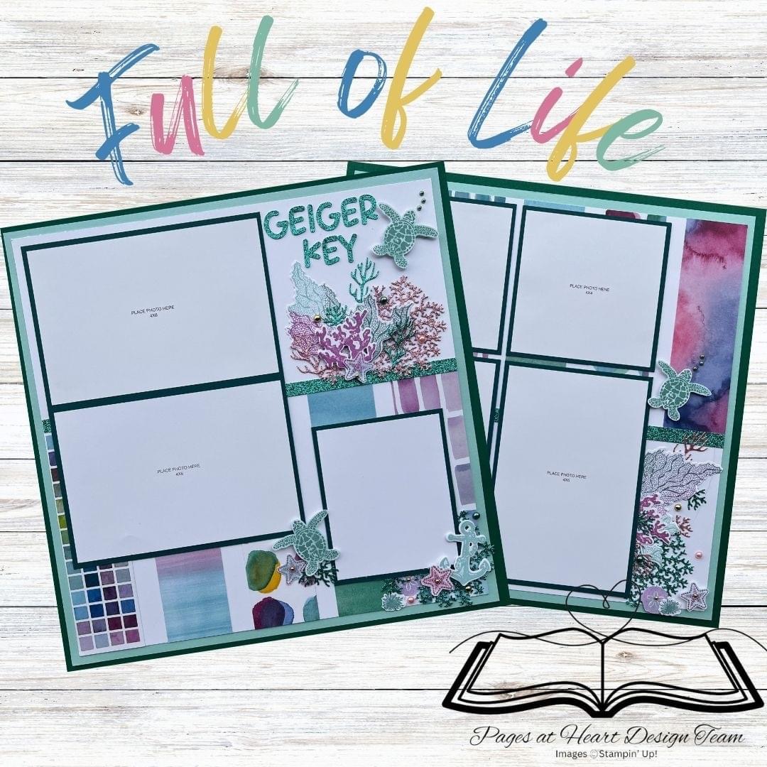 This 6 page Layout Workshop uses the Full of Life Designer Series Paper which is 6 x 6 in size. We then added the Beauty of the Deep Cling & Dies PLUS a splash of Glitter Paper and gems for an under the sea look! The titles are Cricut Cuts, which means you can create any title that complements your photos the best